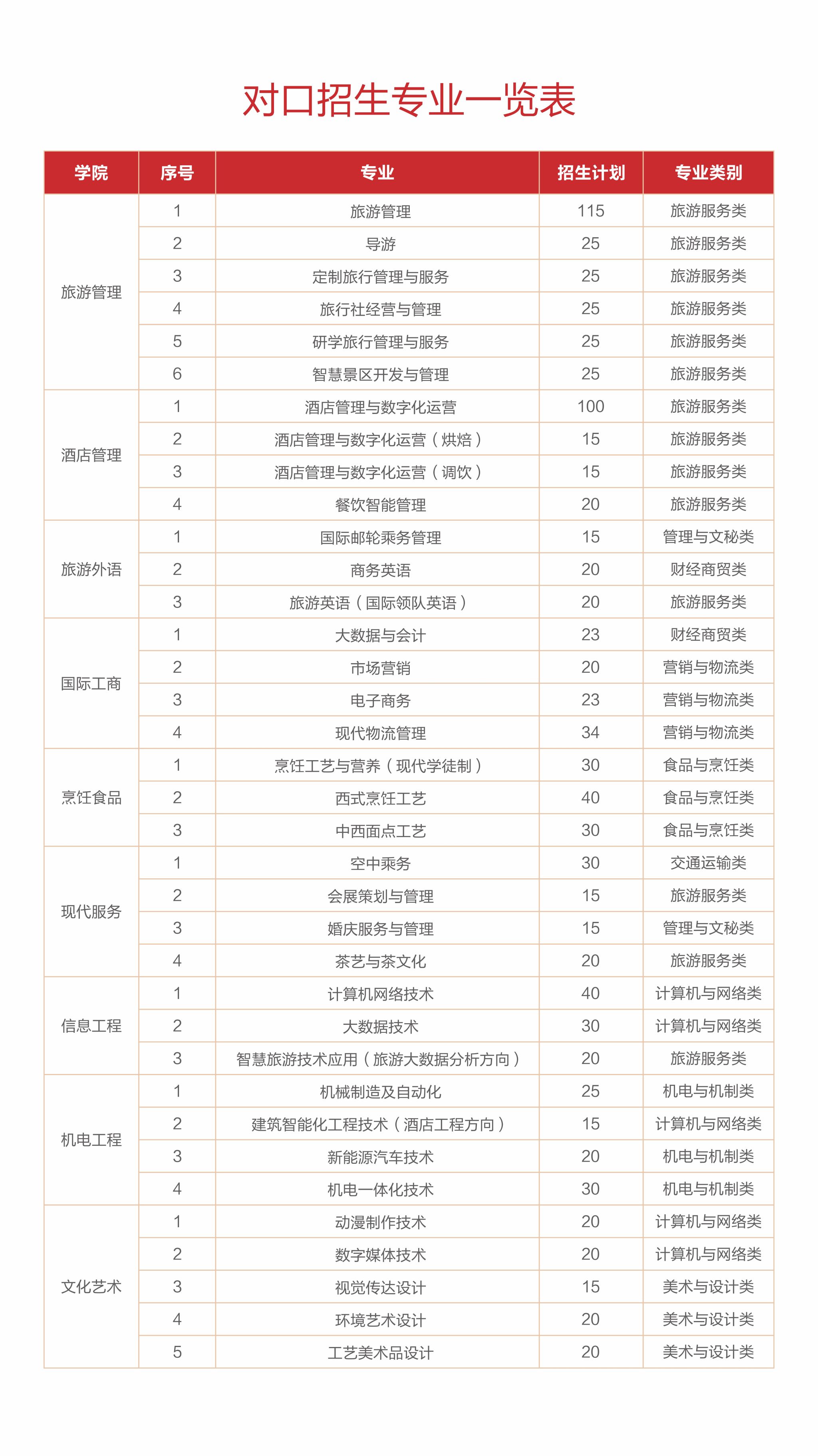 郑州旅游职业学院2025年对口招生专业一览表